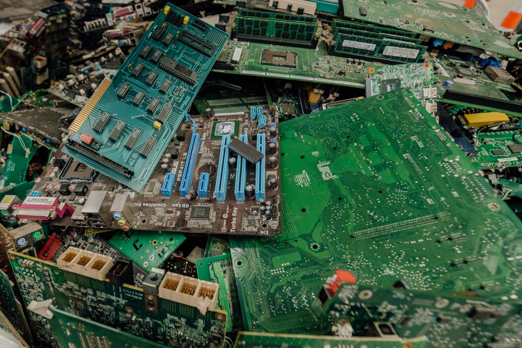 Redundant equipment is separated into different waste streams including old computer equipment, circuit boards, copper cables, lead batteries, and all types of metals, which are then processed for reusing, reselling, or recycling.
